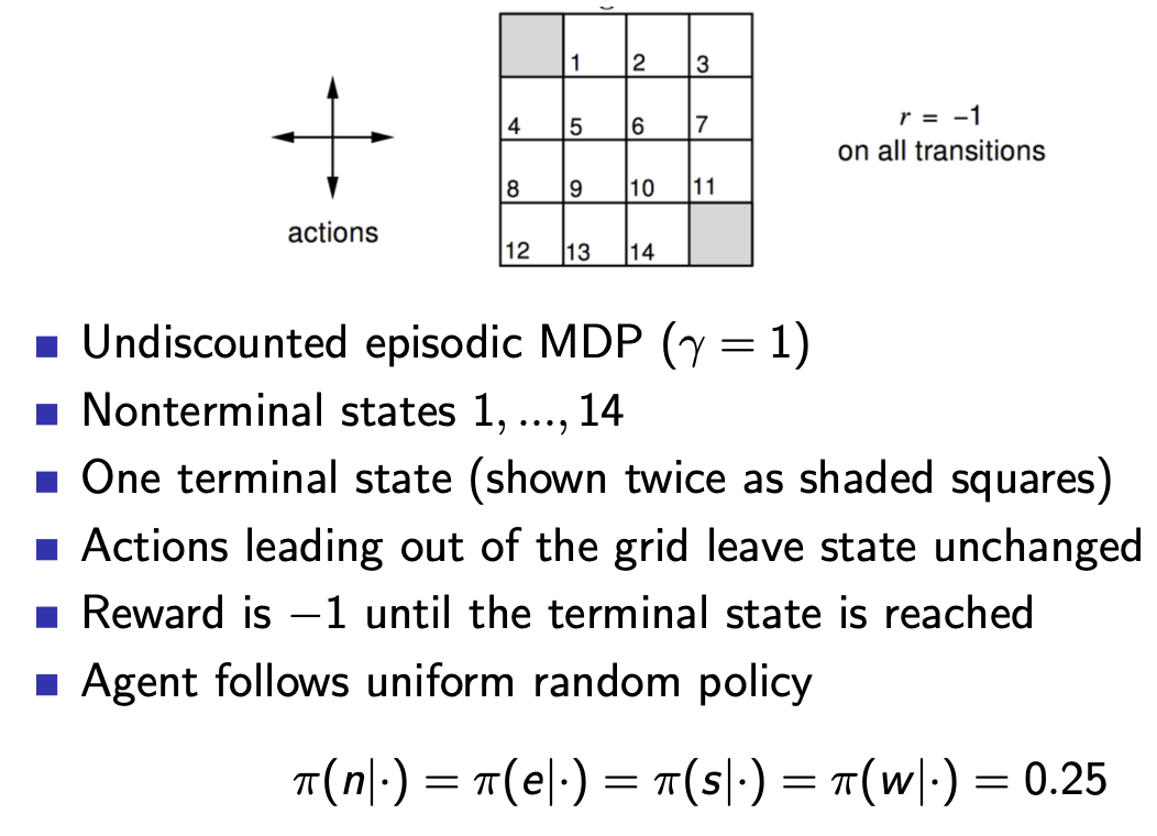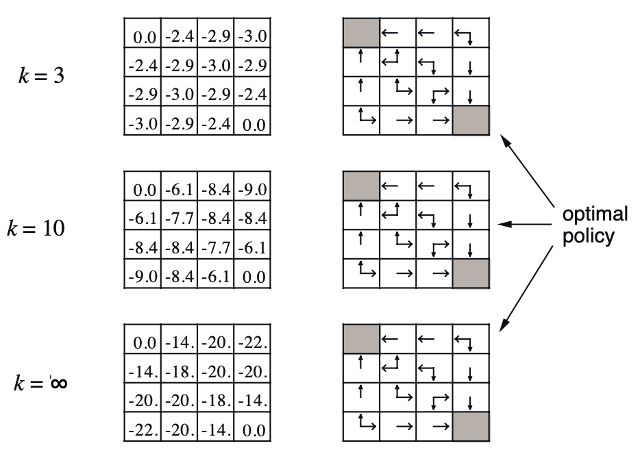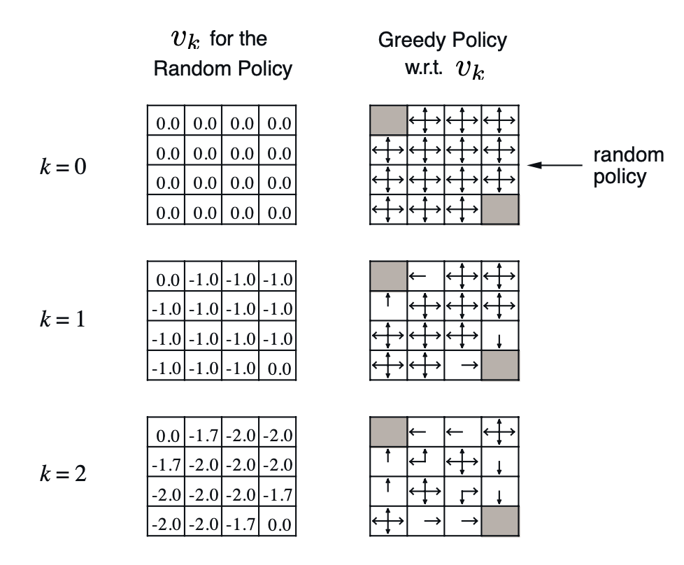 We can see in the following example that each step updates the value function closer to \(v_{\pi}\). In the particular case of state 1 between k=1 and k=2, the update goes as follows: \[v_2(1) = 0.25 × [-1 + (-1.0)] + 0.25 × [-1 + (-1.0)] + 0.25 × [-1 + (-1.0)] + 0.25 × [-1 + 0.0] = -1.75\]